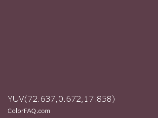 YUV 72.637,0.672,17.858 Color is a dark rose color and the nearest color is Eggplant #614051. Hex code #5d3e4a and RGB value is rgb(93,62,74). In RGB color space, this color is composed of 36% red, 24% green, 29% blue, In CMYK color space, this color is composed of 0% cyan, 33% magenta, 20% yellow , 64% black , In HSL color space, this color has a hue angle of 337° , 20% saturation and 30% lightness.