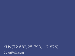 YUV 72.682,25.793,-12.876 Color is a normal blue color and the nearest color is East Bay #414c7d. Hex code #3a467d and RGB value is rgb(58,70,125). In RGB color space, this color is composed of 23% red, 27% green, 49% blue, In CMYK color space, this color is composed of 54% cyan, 44% magenta, 0% yellow , 51% black , In HSL color space, this color has a hue angle of 229° , 37% saturation and 36% lightness.