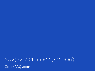 YUV 72.704,55.855,-41.836 Color is a normal blue color and the nearest color is Sapphire #0f52ba. Hex code #194bba and RGB value is rgb(25,75,186). In RGB color space, this color is composed of 10% red, 29% green, 73% blue, In CMYK color space, this color is composed of 87% cyan, 60% magenta, 0% yellow , 27% black , In HSL color space, this color has a hue angle of 221° , 76% saturation and 41% lightness.