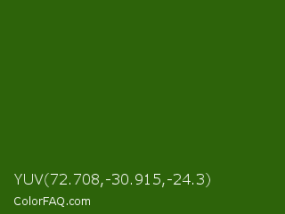 YUV 72.708,-30.915,-24.3 Color is a very dark green color and the nearest color is Dell #396413. Hex code #2d630a and RGB value is rgb(45,99,10). In RGB color space, this color is composed of 18% red, 39% green, 4% blue, In CMYK color space, this color is composed of 55% cyan, 0% magenta, 90% yellow , 61% black , In HSL color space, this color has a hue angle of 96° , 82% saturation and 21% lightness.