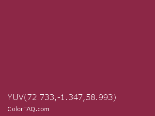 YUV 72.733,-1.347,58.993 Color is a normal rose color and the nearest color is Big Dip O Ruby #9c2542. Hex code #8c2746 and RGB value is rgb(140,39,70). In RGB color space, this color is composed of 55% red, 15% green, 27% blue, In CMYK color space, this color is composed of 0% cyan, 72% magenta, 50% yellow , 45% black , In HSL color space, this color has a hue angle of 342° , 56% saturation and 35% lightness.