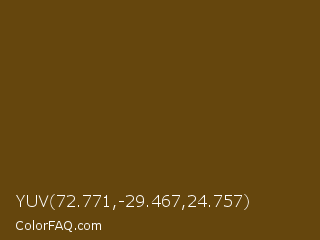 YUV 72.771,-29.467,24.757 Color is a very dark orange color and the nearest color is Horses Neck #604913. Hex code #65460d and RGB value is rgb(101,70,13). In RGB color space, this color is composed of 40% red, 27% green, 5% blue, In CMYK color space, this color is composed of 0% cyan, 31% magenta, 87% yellow , 60% black , In HSL color space, this color has a hue angle of 39° , 77% saturation and 22% lightness.