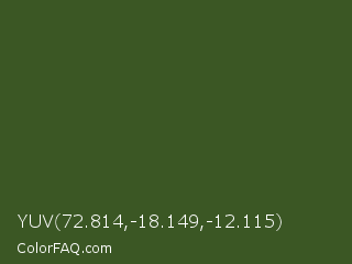 YUV 72.814,-18.149,-12.115 Color is a dark green color and the nearest color is Dark Moss Green #4a5d23. Hex code #3b5724 and RGB value is rgb(59,87,36). In RGB color space, this color is composed of 23% red, 34% green, 14% blue, In CMYK color space, this color is composed of 32% cyan, 0% magenta, 59% yellow , 66% black , In HSL color space, this color has a hue angle of 93° , 41% saturation and 24% lightness.