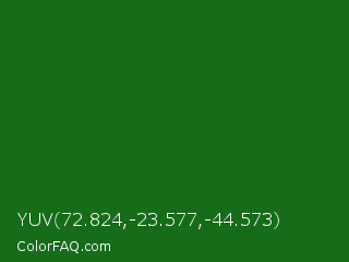 YUV 72.824,-23.577,-44.573 Color is a dark green color and the nearest color is Japanese Laurel #0a6906. Hex code #166c19 and RGB value is rgb(22,108,25). In RGB color space, this color is composed of 9% red, 42% green, 10% blue, In CMYK color space, this color is composed of 80% cyan, 0% magenta, 77% yellow , 58% black , In HSL color space, this color has a hue angle of 122° , 66% saturation and 25% lightness.