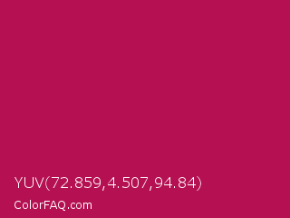 YUV 72.859,4.507,94.84 Color is a normal rose color and the nearest color is Pictorial Carmine #c30b4e. Hex code #b51052 and RGB value is rgb(181,16,82). In RGB color space, this color is composed of 71% red, 6% green, 32% blue, In CMYK color space, this color is composed of 0% cyan, 91% magenta, 55% yellow , 29% black , In HSL color space, this color has a hue angle of 336° , 84% saturation and 39% lightness.