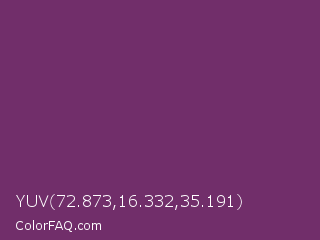 YUV 72.873,16.332,35.191 Color is a normal magenta color and the nearest color is Byzantium #702963. Hex code #712e6a and RGB value is rgb(113,46,106). In RGB color space, this color is composed of 44% red, 18% green, 42% blue, In CMYK color space, this color is composed of 0% cyan, 59% magenta, 6% yellow , 56% black , In HSL color space, this color has a hue angle of 306° , 42% saturation and 31% lightness.
