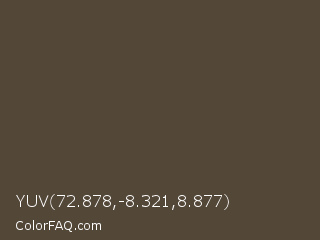 YUV 72.878,-8.321,8.877 Color is a dark orange color and the nearest color is Judge Gray #544333. Hex code #534738 and RGB value is rgb(83,71,56). In RGB color space, this color is composed of 33% red, 28% green, 22% blue, In CMYK color space, this color is composed of 0% cyan, 14% magenta, 33% yellow , 67% black , In HSL color space, this color has a hue angle of 33° , 19% saturation and 27% lightness.