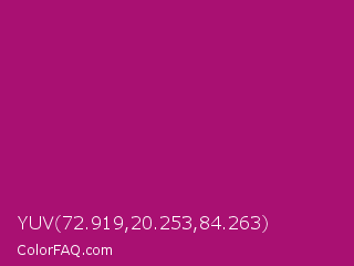 YUV 72.919,20.253,84.263 Color is a normal magenta color and the nearest color is Flirt #a2006d. Hex code #a91072 and RGB value is rgb(169,16,114). In RGB color space, this color is composed of 66% red, 6% green, 45% blue, In CMYK color space, this color is composed of 0% cyan, 91% magenta, 33% yellow , 34% black , In HSL color space, this color has a hue angle of 322° , 83% saturation and 36% lightness.