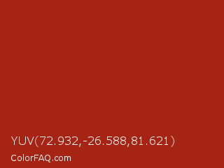 YUV 72.932,-26.588,81.621 Color is a normal red color and the nearest color is Tabasco #a02712. Hex code #a62413 and RGB value is rgb(166,36,19). In RGB color space, this color is composed of 65% red, 14% green, 7% blue, In CMYK color space, this color is composed of 0% cyan, 78% magenta, 89% yellow , 35% black , In HSL color space, this color has a hue angle of 7° , 79% saturation and 36% lightness.