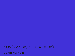 YUV 72.936,71.024,-6.96 Color is a normal indigo color and the nearest color is Palatinate Blue #273be2. Hex code #4131d9 and RGB value is rgb(65,49,217). In RGB color space, this color is composed of 25% red, 19% green, 85% blue, In CMYK color space, this color is composed of 70% cyan, 77% magenta, 0% yellow , 15% black , In HSL color space, this color has a hue angle of 246° , 69% saturation and 52% lightness.
