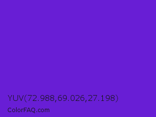 YUV 72.988,69.026,27.198 Color is a normal violet color and the nearest color is Purple Heart Crayola #652dc1. Hex code #681ed5 and RGB value is rgb(104,30,213). In RGB color space, this color is composed of 41% red, 12% green, 84% blue, In CMYK color space, this color is composed of 51% cyan, 86% magenta, 0% yellow , 16% black , In HSL color space, this color has a hue angle of 264° , 75% saturation and 48% lightness.