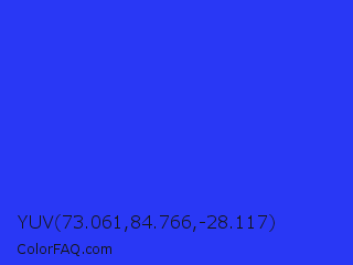 YUV 73.061,84.766,-28.117 Color is a normal blue color and the nearest color is Palatinate Blue #273be2. Hex code #2938f5 and RGB value is rgb(41,56,245). In RGB color space, this color is composed of 16% red, 22% green, 96% blue, In CMYK color space, this color is composed of 83% cyan, 77% magenta, 0% yellow , 4% black , In HSL color space, this color has a hue angle of 236° , 91% saturation and 56% lightness.