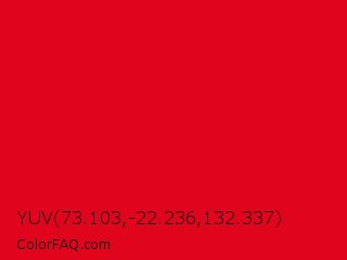 YUV 73.103,-22.236,132.337 Color is a normal red color and the nearest color is Cadmium Red #e30022. Hex code #e0051c and RGB value is rgb(224,5,28). In RGB color space, this color is composed of 88% red, 2% green, 11% blue, In CMYK color space, this color is composed of 0% cyan, 98% magenta, 88% yellow , 12% black , In HSL color space, this color has a hue angle of 354° , 96% saturation and 45% lightness.