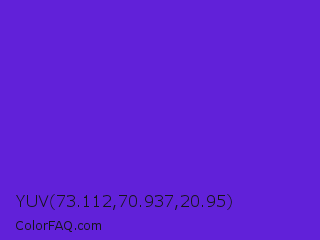 YUV 73.112,70.937,20.95 Color is a normal violet color and the nearest color is Purple Heart Crayola #652dc1. Hex code #6121d9 and RGB value is rgb(97,33,217). In RGB color space, this color is composed of 38% red, 13% green, 85% blue, In CMYK color space, this color is composed of 55% cyan, 85% magenta, 0% yellow , 15% black , In HSL color space, this color has a hue angle of 261° , 74% saturation and 49% lightness.