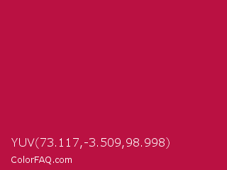 YUV 73.117,-3.509,98.998 Color is a normal rose color and the nearest color is Pictorial Carmine #c30b4e. Hex code #ba1142 and RGB value is rgb(186,17,66). In RGB color space, this color is composed of 73% red, 7% green, 26% blue, In CMYK color space, this color is composed of 0% cyan, 91% magenta, 65% yellow , 27% black , In HSL color space, this color has a hue angle of 343° , 83% saturation and 40% lightness.