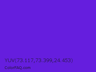 YUV 73.117,73.399,24.453 Color is a normal violet color and the nearest color is Purple Heart Crayola #652dc1. Hex code #651ede and RGB value is rgb(101,30,222). In RGB color space, this color is composed of 40% red, 12% green, 87% blue, In CMYK color space, this color is composed of 55% cyan, 86% magenta, 0% yellow , 13% black , In HSL color space, this color has a hue angle of 262° , 76% saturation and 49% lightness.