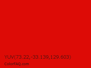 YUV 73.22,-33.139,129.603 Color is a normal red color and the nearest color is Rosso Corsa #d40000. Hex code #dd0b06 and RGB value is rgb(221,11,6). In RGB color space, this color is composed of 87% red, 4% green, 2% blue, In CMYK color space, this color is composed of 0% cyan, 95% magenta, 97% yellow , 13% black , In HSL color space, this color has a hue angle of 1° , 95% saturation and 45% lightness.