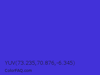 YUV 73.235,70.876,-6.345 Color is a normal indigo color and the nearest color is Palatinate Blue #273be2. Hex code #4231d9 and RGB value is rgb(66,49,217). In RGB color space, this color is composed of 26% red, 19% green, 85% blue, In CMYK color space, this color is composed of 70% cyan, 77% magenta, 0% yellow , 15% black , In HSL color space, this color has a hue angle of 246° , 69% saturation and 52% lightness.