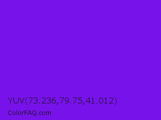YUV 73.236,79.75,41.012 Color is a normal violet color and the nearest color is Violet Color Wheel #7f00ff. Hex code #7812eb and RGB value is rgb(120,18,235). In RGB color space, this color is composed of 47% red, 7% green, 92% blue, In CMYK color space, this color is composed of 49% cyan, 92% magenta, 0% yellow , 8% black , In HSL color space, this color has a hue angle of 268° , 86% saturation and 50% lightness.