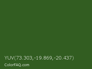 YUV 73.303,-19.869,-20.437 Color is a dark green color and the nearest color is Mughal Green #306030. Hex code #325d21 and RGB value is rgb(50,93,33). In RGB color space, this color is composed of 20% red, 36% green, 13% blue, In CMYK color space, this color is composed of 46% cyan, 0% magenta, 65% yellow , 64% black , In HSL color space, this color has a hue angle of 103° , 48% saturation and 25% lightness.