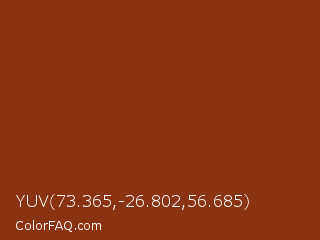 YUV 73.365,-26.802,56.685 Color is a normal orange color and the nearest color is Kobe #882d17. Hex code #8a3313 and RGB value is rgb(138,51,19). In RGB color space, this color is composed of 54% red, 20% green, 7% blue, In CMYK color space, this color is composed of 0% cyan, 63% magenta, 86% yellow , 46% black , In HSL color space, this color has a hue angle of 16° , 76% saturation and 31% lightness.