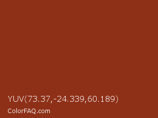 YUV 73.37,-24.339,60.189 Color is a normal red color and the nearest color is Kobe #882d17. Hex code #8e3018 and RGB value is rgb(142,48,24). In RGB color space, this color is composed of 56% red, 19% green, 9% blue, In CMYK color space, this color is composed of 0% cyan, 66% magenta, 83% yellow , 44% black , In HSL color space, this color has a hue angle of 12° , 71% saturation and 33% lightness.