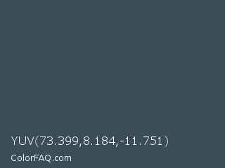 YUV 73.399,8.184,-11.751 Color is a dark blue color and the nearest color is River Bed #434c59. Hex code #3c4d5a and RGB value is rgb(60,77,90). In RGB color space, this color is composed of 24% red, 30% green, 35% blue, In CMYK color space, this color is composed of 33% cyan, 14% magenta, 0% yellow , 65% black , In HSL color space, this color has a hue angle of 206° , 20% saturation and 29% lightness.