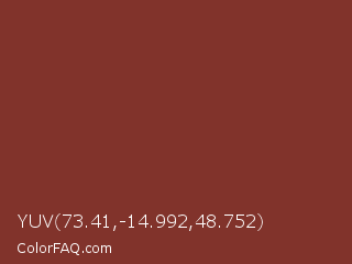 YUV 73.41,-14.992,48.752 Color is a normal red color and the nearest color is Burnt Umber #8a3324. Hex code #81332b and RGB value is rgb(129,51,43). In RGB color space, this color is composed of 51% red, 20% green, 17% blue, In CMYK color space, this color is composed of 0% cyan, 60% magenta, 67% yellow , 49% black , In HSL color space, this color has a hue angle of 6° , 50% saturation and 34% lightness.