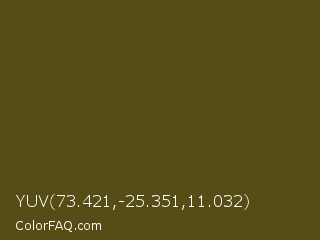 YUV 73.421,-25.351,11.032 Color is a very dark yellow color and the nearest color is Horses Neck #604913. Hex code #564d16 and RGB value is rgb(86,77,22). In RGB color space, this color is composed of 34% red, 30% green, 9% blue, In CMYK color space, this color is composed of 0% cyan, 10% magenta, 74% yellow , 66% black , In HSL color space, this color has a hue angle of 52° , 59% saturation and 21% lightness.