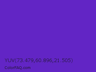 YUV 73.479,60.896,21.505 Color is a normal violet color and the nearest color is Purple Heart Crayola #652dc1. Hex code #6225c5 and RGB value is rgb(98,37,197). In RGB color space, this color is composed of 38% red, 15% green, 77% blue, In CMYK color space, this color is composed of 50% cyan, 81% magenta, 0% yellow , 23% black , In HSL color space, this color has a hue angle of 263° , 68% saturation and 46% lightness.