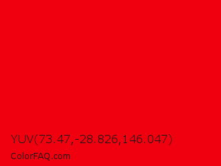 YUV 73.47,-28.826,146.047 Color is a normal red color and the nearest color is KU Crimson #e8000d. Hex code #f0000f and RGB value is rgb(240,0,15). In RGB color space, this color is composed of 94% red, 0% green, 6% blue, In CMYK color space, this color is composed of 0% cyan, 100% magenta, 94% yellow , 6% black , In HSL color space, this color has a hue angle of 356° , 100% saturation and 47% lightness.