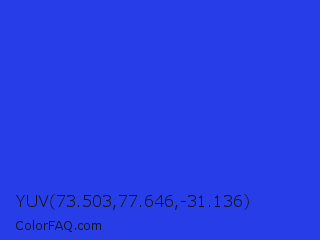 YUV 73.503,77.646,-31.136 Color is a normal blue color and the nearest color is Palatinate Blue #273be2. Hex code #263de7 and RGB value is rgb(38,61,231). In RGB color space, this color is composed of 15% red, 24% green, 91% blue, In CMYK color space, this color is composed of 84% cyan, 74% magenta, 0% yellow , 9% black , In HSL color space, this color has a hue angle of 233° , 80% saturation and 53% lightness.