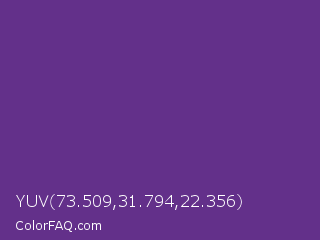 YUV 73.509,31.794,22.356 Color is a normal purple color and the nearest color is Eminence #6c3082. Hex code #63308a and RGB value is rgb(99,48,138). In RGB color space, this color is composed of 39% red, 19% green, 54% blue, In CMYK color space, this color is composed of 28% cyan, 65% magenta, 0% yellow , 46% black , In HSL color space, this color has a hue angle of 274° , 48% saturation and 36% lightness.