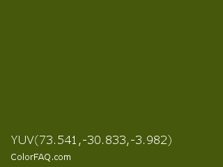 YUV 73.541,-30.833,-3.982 Color is a very dark lime color and the nearest color is Verdun Green #495400. Hex code #45580b and RGB value is rgb(69,88,11). In RGB color space, this color is composed of 27% red, 35% green, 4% blue, In CMYK color space, this color is composed of 22% cyan, 0% magenta, 88% yellow , 65% black , In HSL color space, this color has a hue angle of 75° , 78% saturation and 19% lightness.