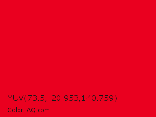 YUV 73.5,-20.953,140.759 Color is a normal red color and the nearest color is Cadmium Red #e30022. Hex code #ea001f and RGB value is rgb(234,-0,31). In RGB color space, this color is composed of 92% red, 0% green, 12% blue, In CMYK color space, this color is composed of 0% cyan, 100% magenta, 87% yellow , 8% black , In HSL color space, this color has a hue angle of 352° , 100% saturation and 46% lightness.