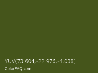 YUV 73.604,-22.976,-4.038 Color is a very dark lime color and the nearest color is Army Green #4b5320. Hex code #45551b and RGB value is rgb(69,85,27). In RGB color space, this color is composed of 27% red, 33% green, 11% blue, In CMYK color space, this color is composed of 19% cyan, 0% magenta, 68% yellow , 67% black , In HSL color space, this color has a hue angle of 77° , 52% saturation and 22% lightness.