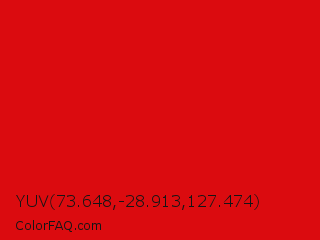 YUV 73.648,-28.913,127.474 Color is a normal red color and the nearest color is KU Crimson #e8000d. Hex code #db0b0f and RGB value is rgb(219,11,15). In RGB color space, this color is composed of 86% red, 4% green, 6% blue, In CMYK color space, this color is composed of 0% cyan, 95% magenta, 93% yellow , 14% black , In HSL color space, this color has a hue angle of 359° , 90% saturation and 45% lightness.