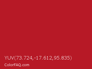 YUV 73.724,-17.612,95.835 Color is a normal red color and the nearest color is Firebrick #b22222. Hex code #b71926 and RGB value is rgb(183,25,38). In RGB color space, this color is composed of 72% red, 10% green, 15% blue, In CMYK color space, this color is composed of 0% cyan, 86% magenta, 79% yellow , 28% black , In HSL color space, this color has a hue angle of 355° , 76% saturation and 41% lightness.