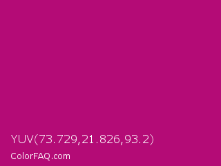 YUV 73.729,21.826,93.2 Color is a normal magenta color and the nearest color is Lipstick #ab0563. Hex code #b40b76 and RGB value is rgb(180,11,118). In RGB color space, this color is composed of 71% red, 4% green, 46% blue, In CMYK color space, this color is composed of 0% cyan, 94% magenta, 34% yellow , 29% black , In HSL color space, this color has a hue angle of 322° , 88% saturation and 37% lightness.