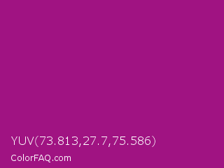 YUV 73.813,27.7,75.586 Color is a normal magenta color and the nearest color is Violet Eggplant #991199. Hex code #a01382 and RGB value is rgb(160,19,130). In RGB color space, this color is composed of 63% red, 7% green, 51% blue, In CMYK color space, this color is composed of 0% cyan, 88% magenta, 19% yellow , 37% black , In HSL color space, this color has a hue angle of 313° , 79% saturation and 35% lightness.