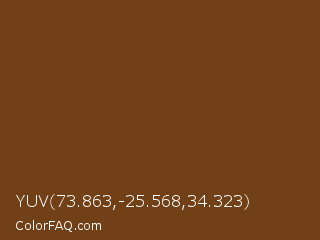 YUV 73.863,-25.568,34.323 Color is a dark orange color and the nearest color is Sepia #704214. Hex code #714016 and RGB value is rgb(113,64,22). In RGB color space, this color is composed of 44% red, 25% green, 9% blue, In CMYK color space, this color is composed of 0% cyan, 43% magenta, 81% yellow , 56% black , In HSL color space, this color has a hue angle of 28° , 67% saturation and 26% lightness.