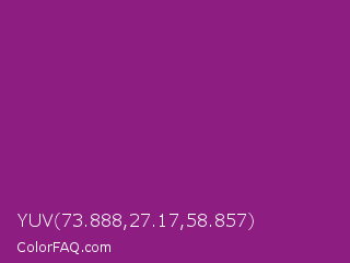 YUV 73.888,27.17,58.857 Color is a normal magenta color and the nearest color is Razzmic Berry Crayola #843179. Hex code #8d1d81 and RGB value is rgb(141,29,129). In RGB color space, this color is composed of 55% red, 11% green, 51% blue, In CMYK color space, this color is composed of 0% cyan, 79% magenta, 9% yellow , 45% black , In HSL color space, this color has a hue angle of 306° , 66% saturation and 33% lightness.