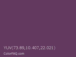 YUV 73.89,10.407,22.021 Color is a normal magenta color and the nearest color is Ube Halaya #663854. Hex code #63395f and RGB value is rgb(99,57,95). In RGB color space, this color is composed of 39% red, 22% green, 37% blue, In CMYK color space, this color is composed of 0% cyan, 42% magenta, 4% yellow , 61% black , In HSL color space, this color has a hue angle of 306° , 27% saturation and 31% lightness.