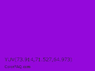 YUV 73.914,71.527,64.973 Color is a normal purple color and the nearest color is Dark Violet #9400d3. Hex code #9408db and RGB value is rgb(148,8,219). In RGB color space, this color is composed of 58% red, 3% green, 86% blue, In CMYK color space, this color is composed of 32% cyan, 96% magenta, 0% yellow , 14% black , In HSL color space, this color has a hue angle of 280° , 93% saturation and 45% lightness.