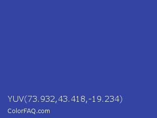 YUV 73.932,43.418,-19.234 Color is a normal blue color and the nearest color is Sapphire #2f519e. Hex code #3444a2 and RGB value is rgb(52,68,162). In RGB color space, this color is composed of 20% red, 27% green, 64% blue, In CMYK color space, this color is composed of 68% cyan, 58% magenta, 0% yellow , 36% black , In HSL color space, this color has a hue angle of 231° , 51% saturation and 42% lightness.