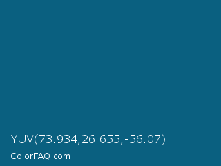 YUV 73.934,26.655,-56.07 Color is a dark blue color and the nearest color is Blue Sapphire #126180. Hex code #0a6080 and RGB value is rgb(10,96,128). In RGB color space, this color is composed of 4% red, 38% green, 50% blue, In CMYK color space, this color is composed of 92% cyan, 25% magenta, 0% yellow , 50% black , In HSL color space, this color has a hue angle of 196° , 86% saturation and 27% lightness.