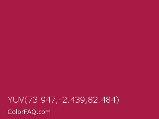YUV 73.947,-2.439,82.484 Color is a normal rose color and the nearest color is French Wine #ac1e44. Hex code #a81b45 and RGB value is rgb(168,27,69). In RGB color space, this color is composed of 66% red, 11% green, 27% blue, In CMYK color space, this color is composed of 0% cyan, 84% magenta, 59% yellow , 34% black , In HSL color space, this color has a hue angle of 342° , 72% saturation and 38% lightness.