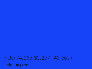 YUV 74.065,85.257,-45.661 Color is a normal blue color and the nearest color is Blue RYB #0247fe. Hex code #1643f7 and RGB value is rgb(22,67,247). In RGB color space, this color is composed of 9% red, 26% green, 97% blue, In CMYK color space, this color is composed of 91% cyan, 73% magenta, 0% yellow , 3% black , In HSL color space, this color has a hue angle of 228° , 93% saturation and 53% lightness.