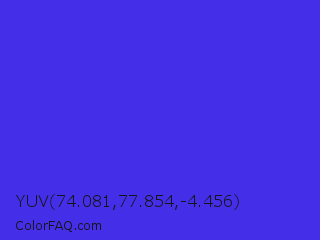 YUV 74.081,77.854,-4.456 Color is a normal indigo color and the nearest color is Han Purple #5218fa. Hex code #452ee8 and RGB value is rgb(69,46,232). In RGB color space, this color is composed of 27% red, 18% green, 91% blue, In CMYK color space, this color is composed of 70% cyan, 80% magenta, 0% yellow , 9% black , In HSL color space, this color has a hue angle of 247° , 80% saturation and 55% lightness.