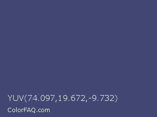 YUV 74.097,19.672,-9.732 Color is a normal blue color and the nearest color is East Bay #414c7d. Hex code #3f4872 and RGB value is rgb(63,72,114). In RGB color space, this color is composed of 25% red, 28% green, 45% blue, In CMYK color space, this color is composed of 45% cyan, 37% magenta, 0% yellow , 55% black , In HSL color space, this color has a hue angle of 229° , 29% saturation and 35% lightness.